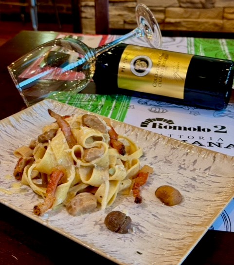 Pappardelle con crema di castagne, funghi porcini, guanciale e pecorino DOP.