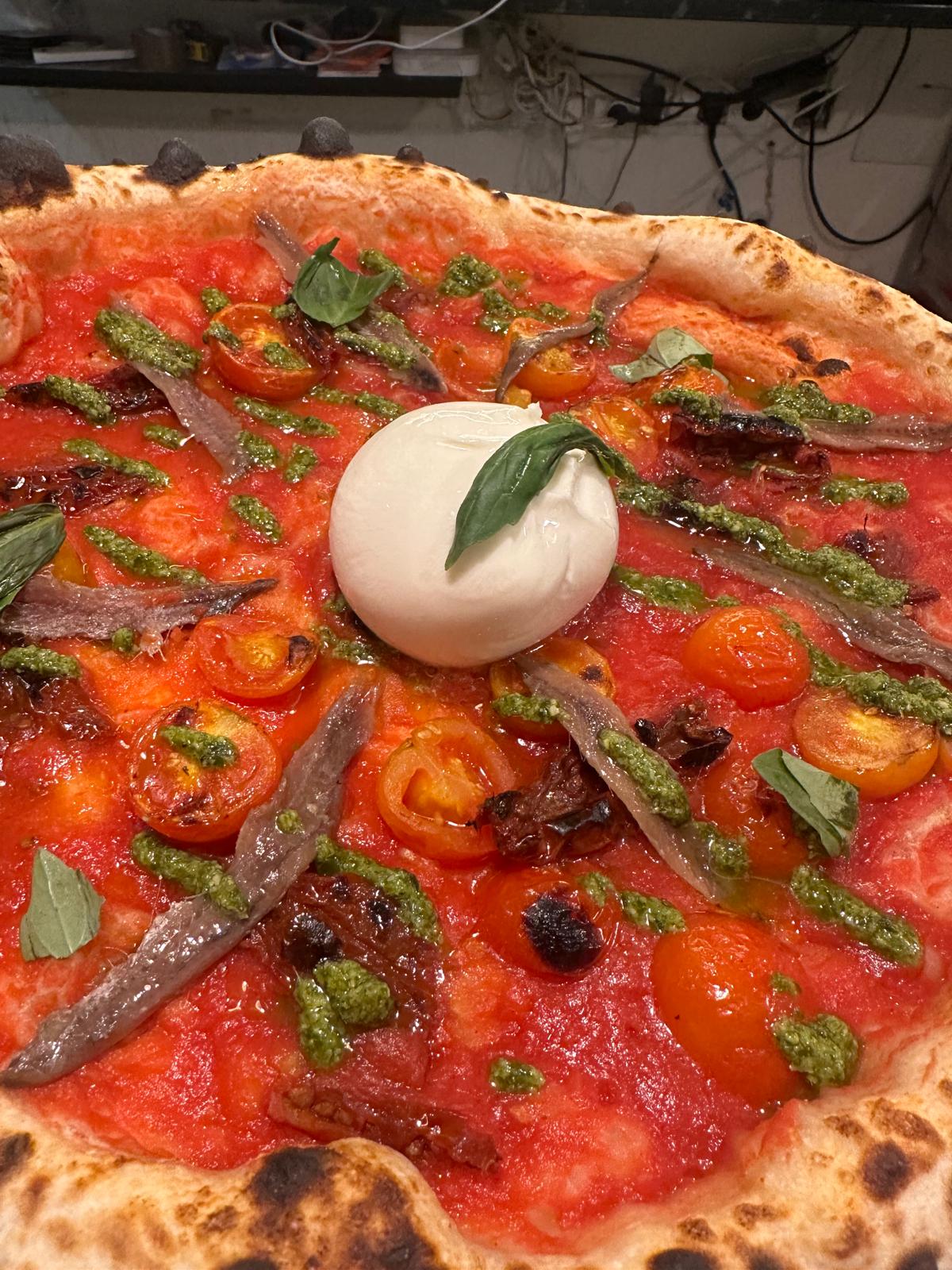 Pizza con tres tipos de tomate: San Marzano, tomates confitados, tomates semisecos, coronados con burratina fresca, pesto de albahaca y anchoas saladas, albahaca. Mediterráneo puro en cada bocado.
